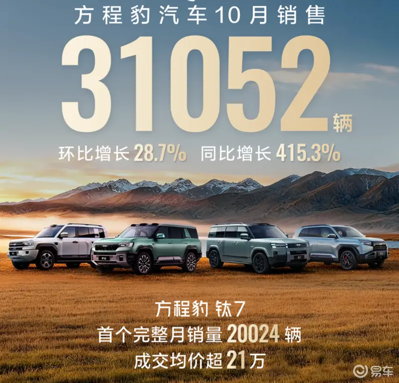 方程豹10月销量正式公布,月销超3.2万辆,环比增长28.7%,其中钛7一款车型月销量就达到了2万辆,占比高达62.5%!