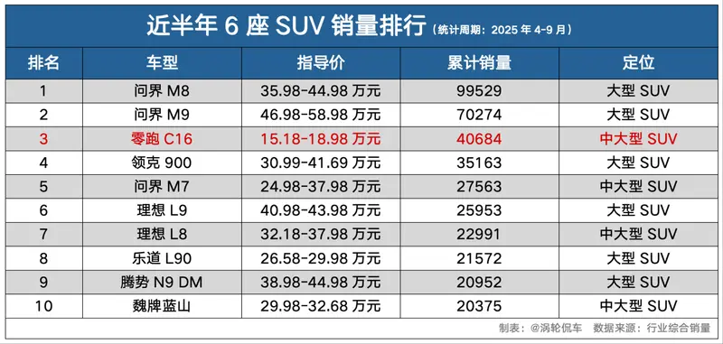 今天,我们说的这款车就是零跑C16,我帮你盘了一下最近半年6座SUV市场销量前十的车型,其中,零跑C16这款车格外扎眼,为啥呢?因为它15.18-18.98万元的定价,显得颇有些“不合群”——销量前十的6座SUV中,售价在20万以内的,只有它自己。