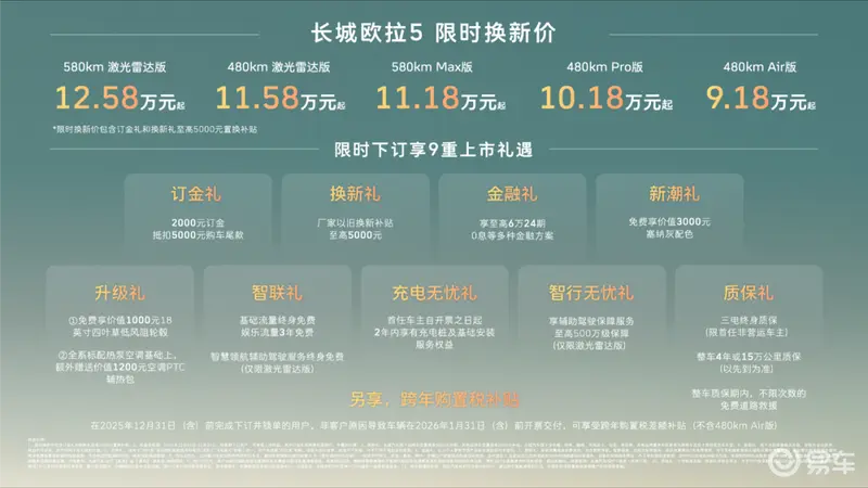 2025年12月16日,长城汽车旗下欧拉品牌的全新A级纯电SUV——欧拉5正式上市,建议零售价9.98万至13.38万元,限时换新价9.18万元起(限时换新价包含“订金礼”和“换新礼”至高5000元以旧换新补贴)。