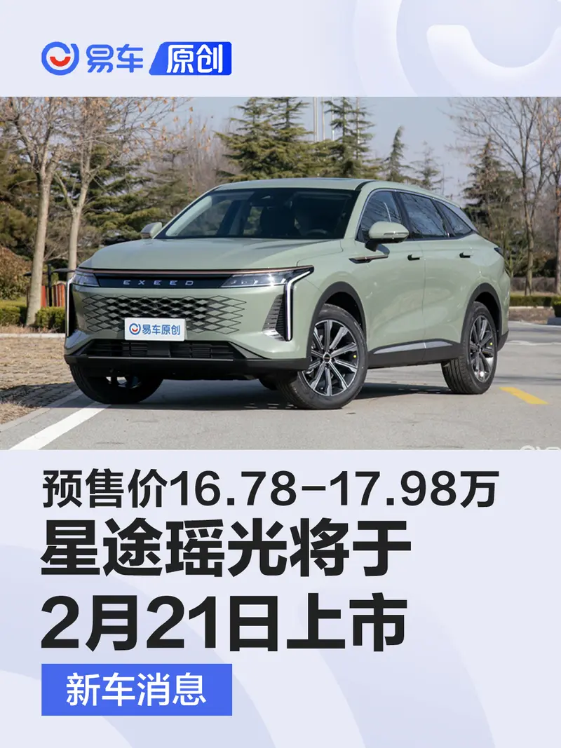 易车讯 日前,我们从官方获悉,星途瑶光将于2月21日正式上市。新车此前已开启预售,共推出2款车型,预售价16.78-17.98万元。新车定位中型SUV,外观内饰采用星途品牌最新设计理念,具有极强的时尚感,整车基于M3X火星架构2.0打造。