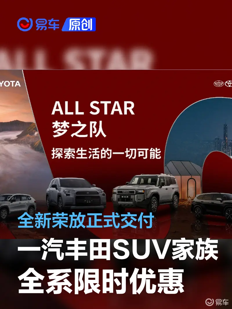 易车讯 2026年1月9日,一汽丰田在长沙举办“全新荣放交付仪式暨SUV家族大会”,宣布旗下重磅车型第六代全新荣放正式开启全国交付;同时,为回馈用户厚爱,包括全新荣放、普拉多、皇冠陆放及锐放在内的SUV家族全系车型,推出覆盖广泛、诚意十足的限时购车福利,以卓越产品力结合实在优惠,满足不同用户需求。