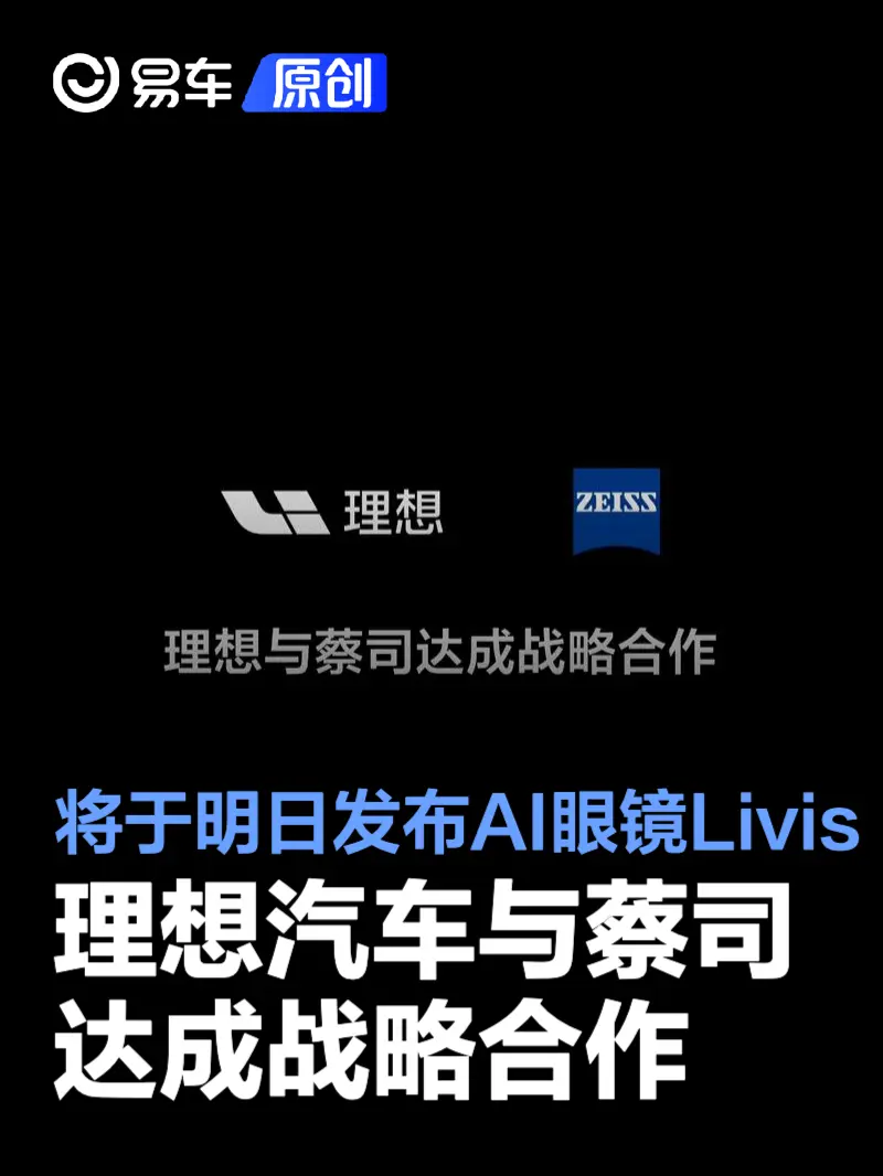 易车讯 12月2日,理想汽车官方宣布与蔡司达成战略合作。据官方介绍,双方将开启全球性的技术及市场合作。据悉,理想AI眼镜Livis将于12月3日正式发布。